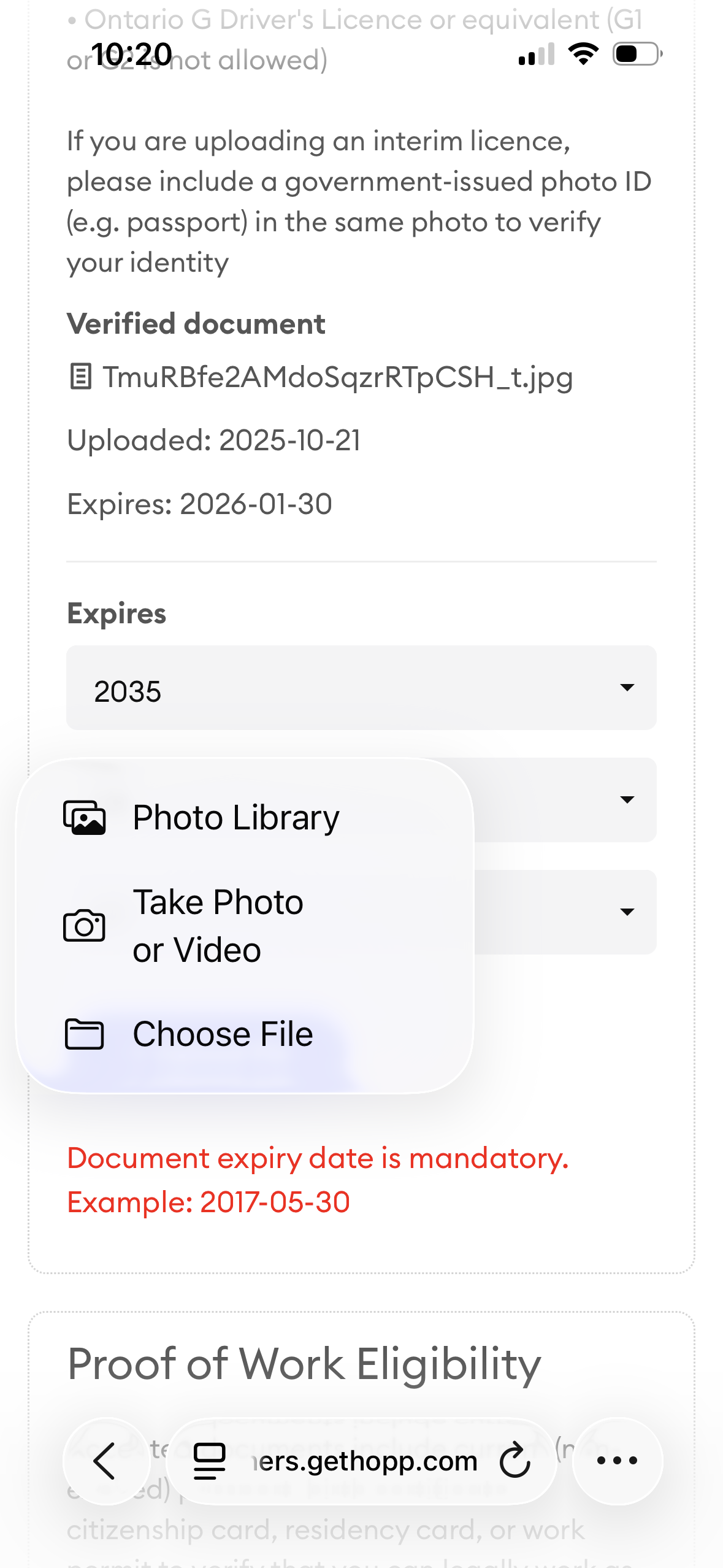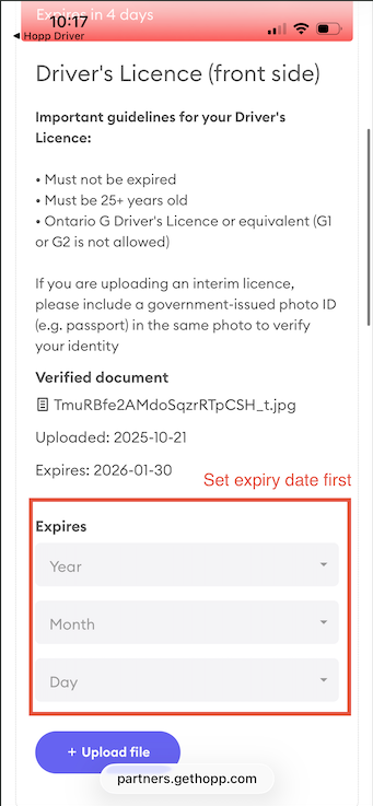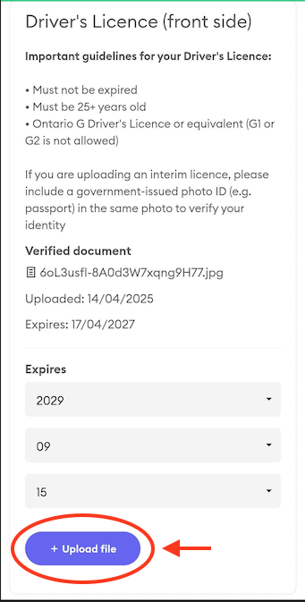 - Select the document you would like to upload and enter the expiry date if applicable