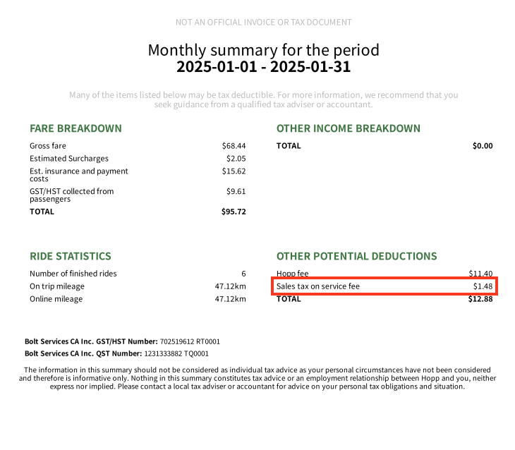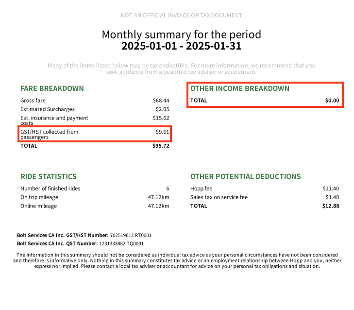 As a Hopp driver, you’re responsible for tracking, remitting, and filing your own GST/HST with the Canada Revenue Agency (CRA). This data is available in your Hopp account and can assist you in preparing to submit your returns.