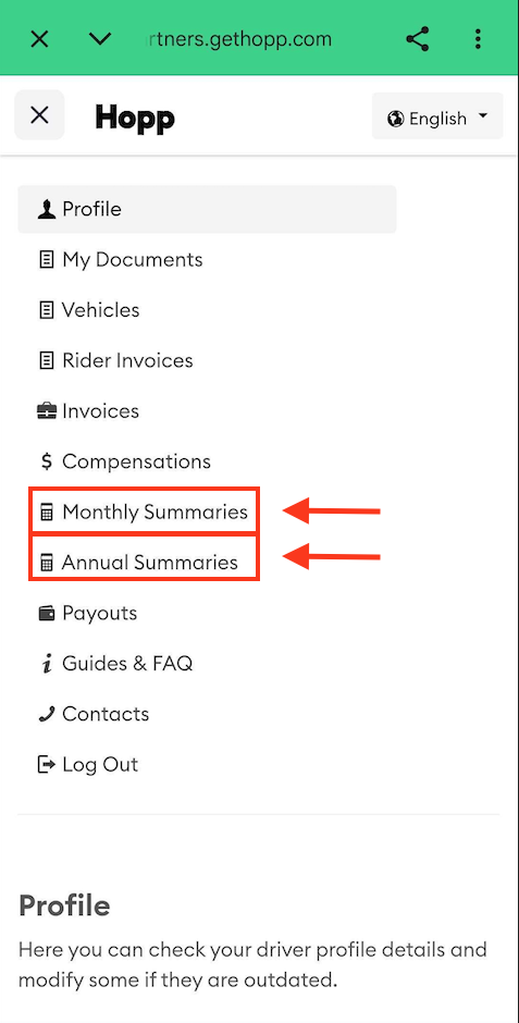 Your Monthly and Annual Summaries bring together all your activity while using Hopp for the given period into one clear overview. You can think of it as a combined summary of all your ride and commission invoices carried out through the platform.