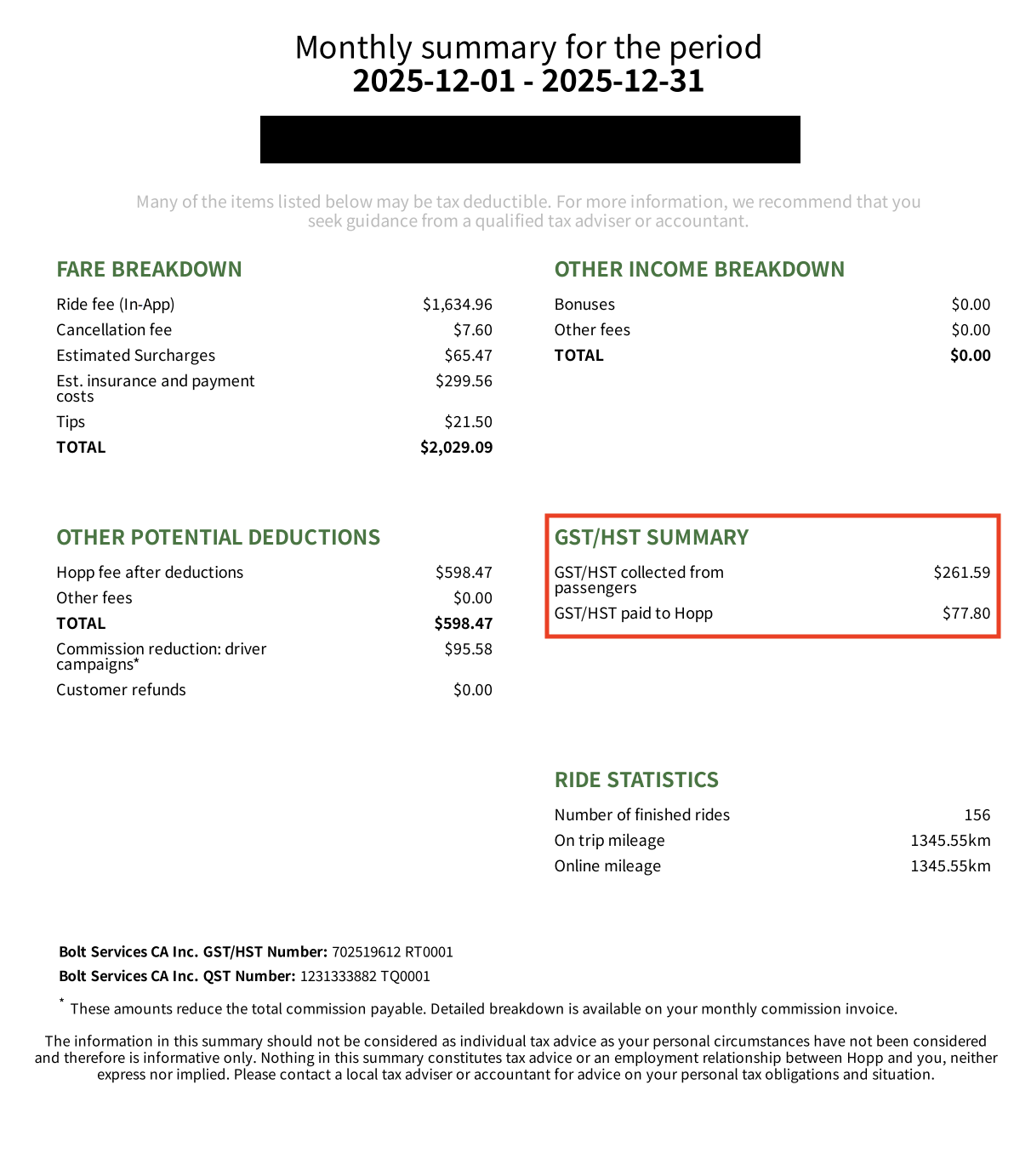 The amount of consideration for the supply of services and the GST/HST you have collected while using Hopp can be found in your Monthly and Annual Summaries.